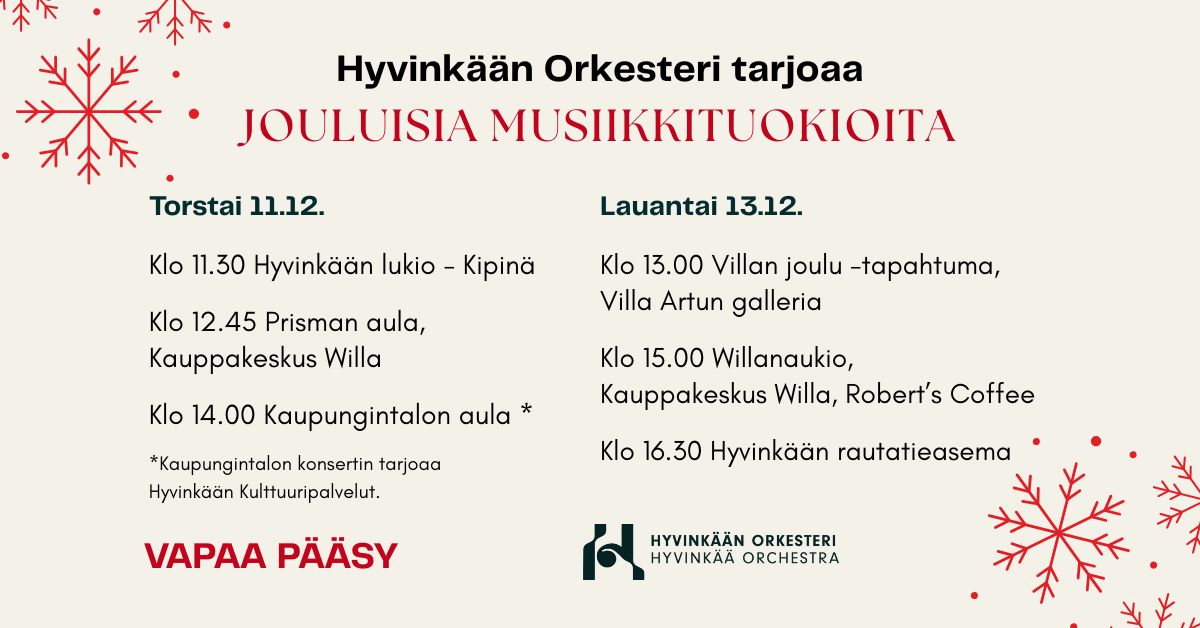 Kahtena päivänä järjestetään yhteensä kuusi konserttia ympäri Hyvinkäätä.